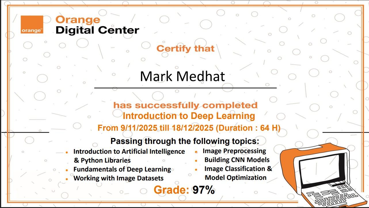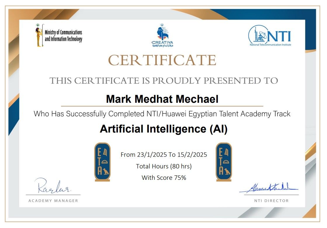 Completed NTI/Huawei Egyptian Talent Academy AI track (80 hours). Applied machine learning concepts to real-world problems and gained hands-on experience with AI tools and frameworks.
