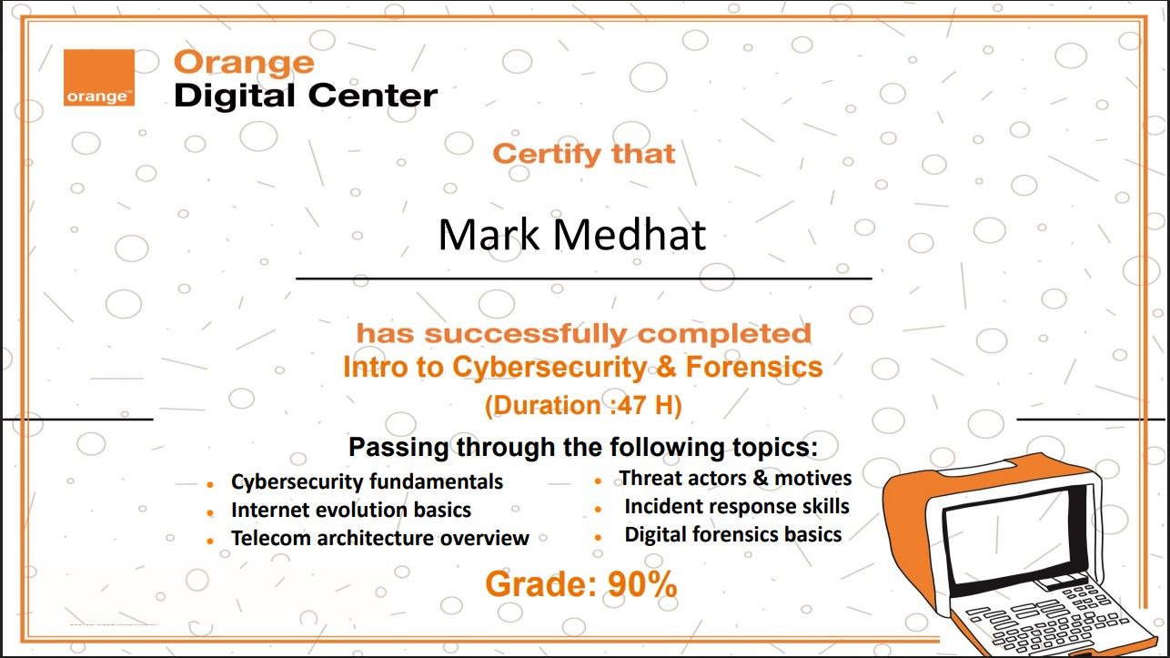 Completed comprehensive training in cybersecurity fundamentals, incident response, and digital forensics. Covered threat actors analysis, telecom architecture, and forensics basics with 90% grade.